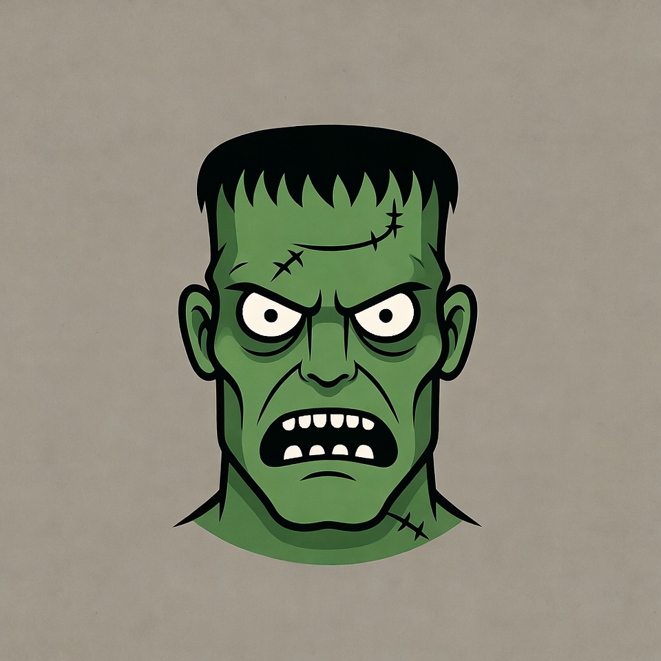 A cartoon illustration of Frankenstein's monster features a green face with black flat-top hair, prominent stitches on the forehead, and angry white eyes. The monster bares its teeth in a fierce snarl. The image is isolated on a plain gray background.