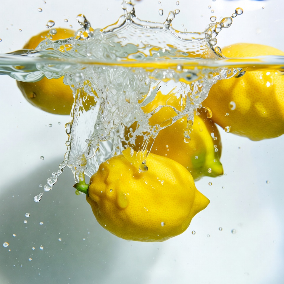 Several fresh yellow lemons splash dynamically in clear water. Water droplets and splashes surround the lemons against a white background. The image captures the motion of water erupting from the submerged fruits.