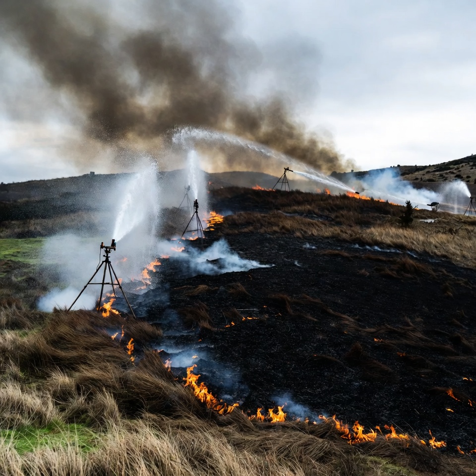 black smoke, burning grass, charred ground, cloudy sky, controlled burn, dry bushes, extinguishing fire, fire sprinklers, fire suppression, flames, grassland, hill, hillside, outdoor fire, smoke, tripod sprinklers, water jets, water spray, wildfire, grass fire