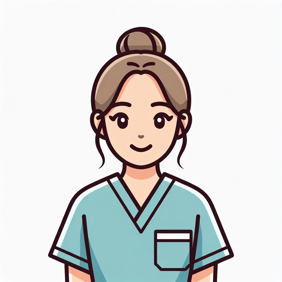 A cartoon Asian woman with brown hair in a bun wears a light blue V-neck nurse uniform. She has large expressive eyes and a gentle smile, standing against a white background. The illustration features clean line art with vibrant colors.