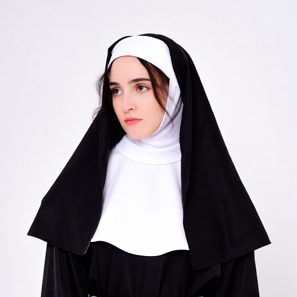 A woman dressed as a nun wears a traditional black and white habit with a white wimple and coif. She has dark brown hair peeking from under the veil and stands against a plain white background. Her expression is neutral with lips slightly pursed.
