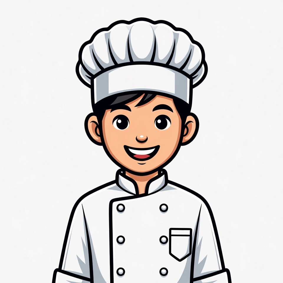 Asian, animated chef, big smile, boy, cartoon, chef hat, chef uniform, clipart, cute boy, drawing, graphic, happy face, illustration, isolated background, kitchen uniform, male, short hair, smiling, toon chef, vector art, white uniform, young boy, chef