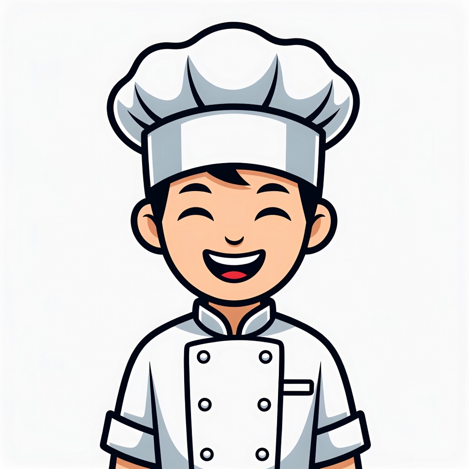 Asian, animated character, apronless chef, boy, cartoon, cheerful, chef hat, chef uniform, clipart, cooking, culinary, eyes closed, food industry, grinning, happy, illustration, isolated background, kitchen, male, smiling, standing pose, vector art, white jacket, young boy, chef
