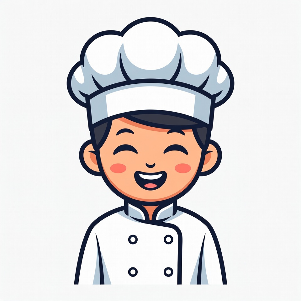 A cartoon illustration of a young Asian boy wearing a white chef's hat and uniform smiles happily on an isolated white background. He has short black hair, rosy cheeks, and squinted eyes with a wide grin. The vector-style drawing features bold outlines and vibrant colors.