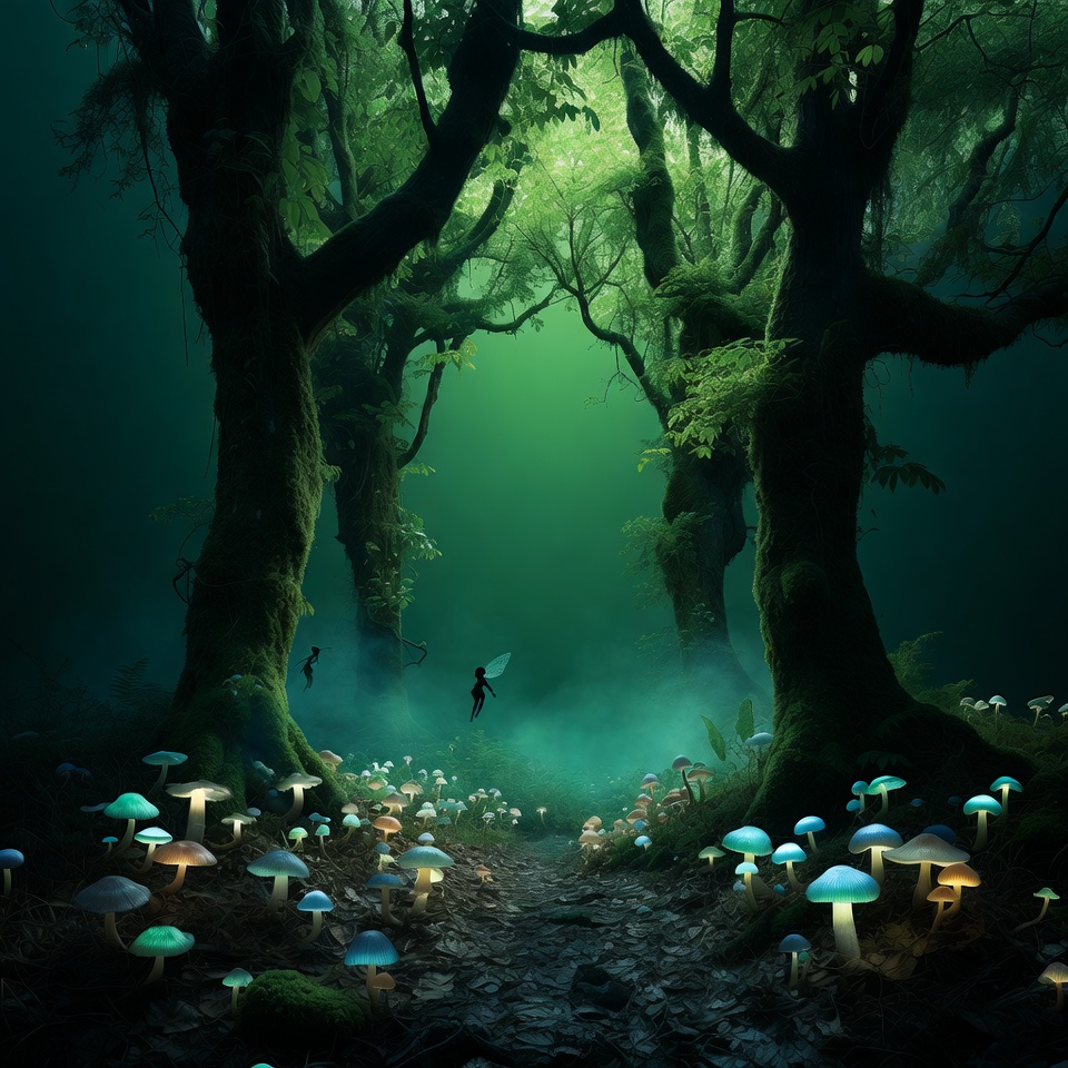 bioluminescent fungi, colorful mushrooms, dark forest, fairy, fairy flying, fairy wings, fantasy illustration, floating fairy, forest mushrooms, forest path, glowing mushrooms, green trees, magical woods, mist, mossy trees, mushroom cluster, mystical scene, nature illustration, woodland path, enchanted forest