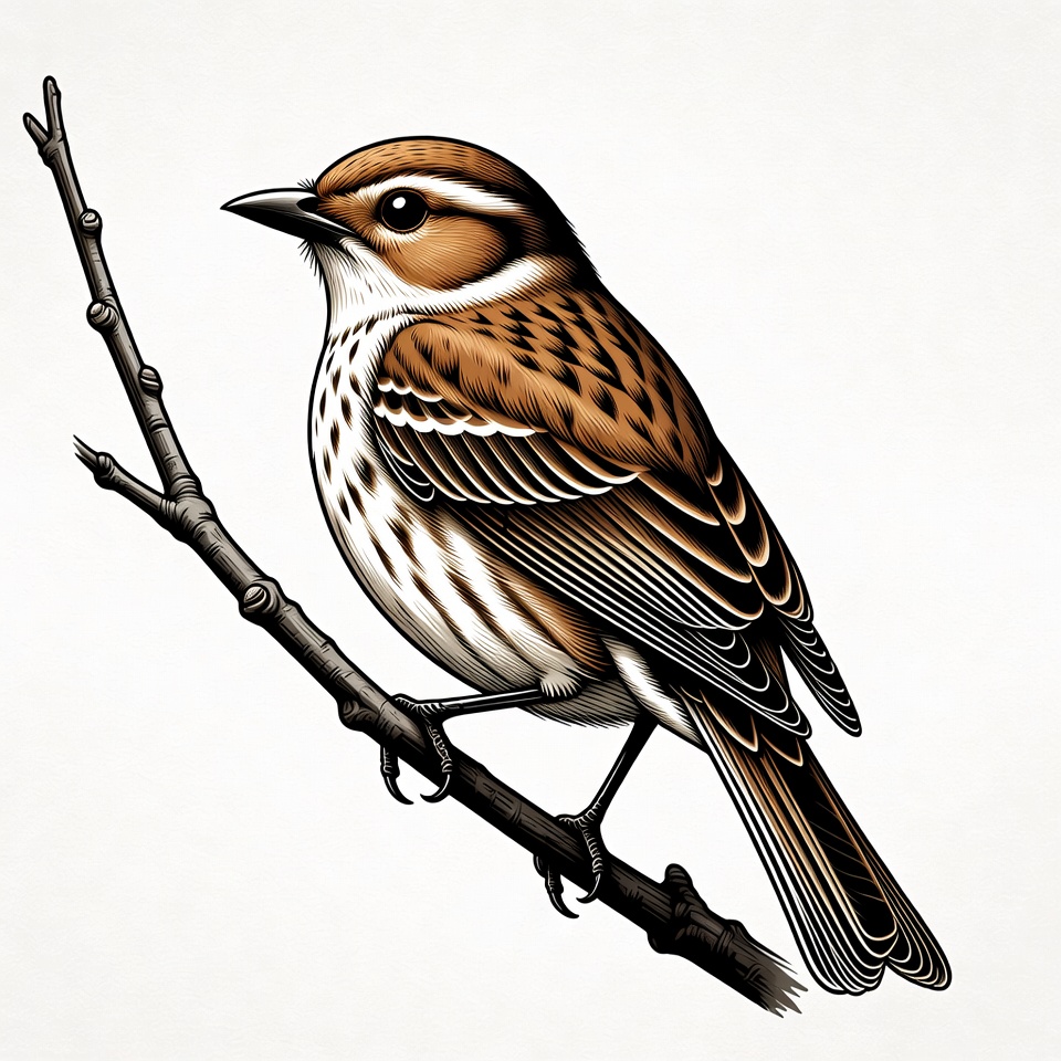A detailed illustration of a rose-breasted grosbeak bird perched on a thin branch. The bird features striking black, white, and rose-colored plumage with brown streaks on its wings and back. It faces left with a sharp beak and attentive eyes, set against an isolated white background.