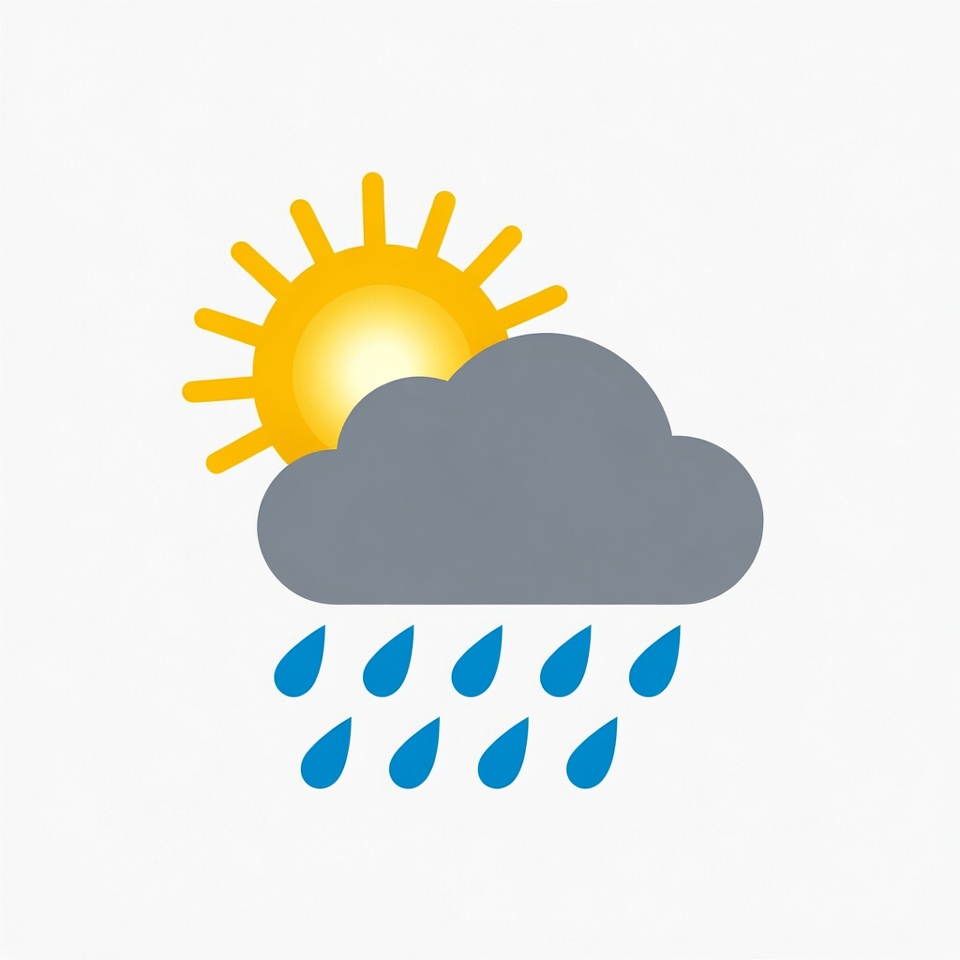 A simple clipart icon features a bright yellow sun partially obscured by a gray cloud. Blue raindrops fall from the cloud. The illustration is set against a white isolated background.