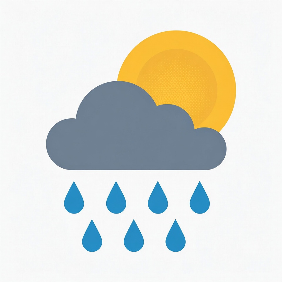 A flat illustration features a yellow sun partially obscured by a large gray cloud. Blue raindrops fall from the cloud. The design is simple with a white background.