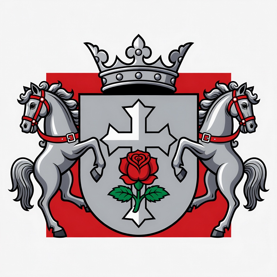 A heraldic coat of arms features a silver shield with a red rose at the center of a white cross. Two gray horses with red bridles rear up on either side, supporting the shield. A golden crown tops the red-bordered emblem.