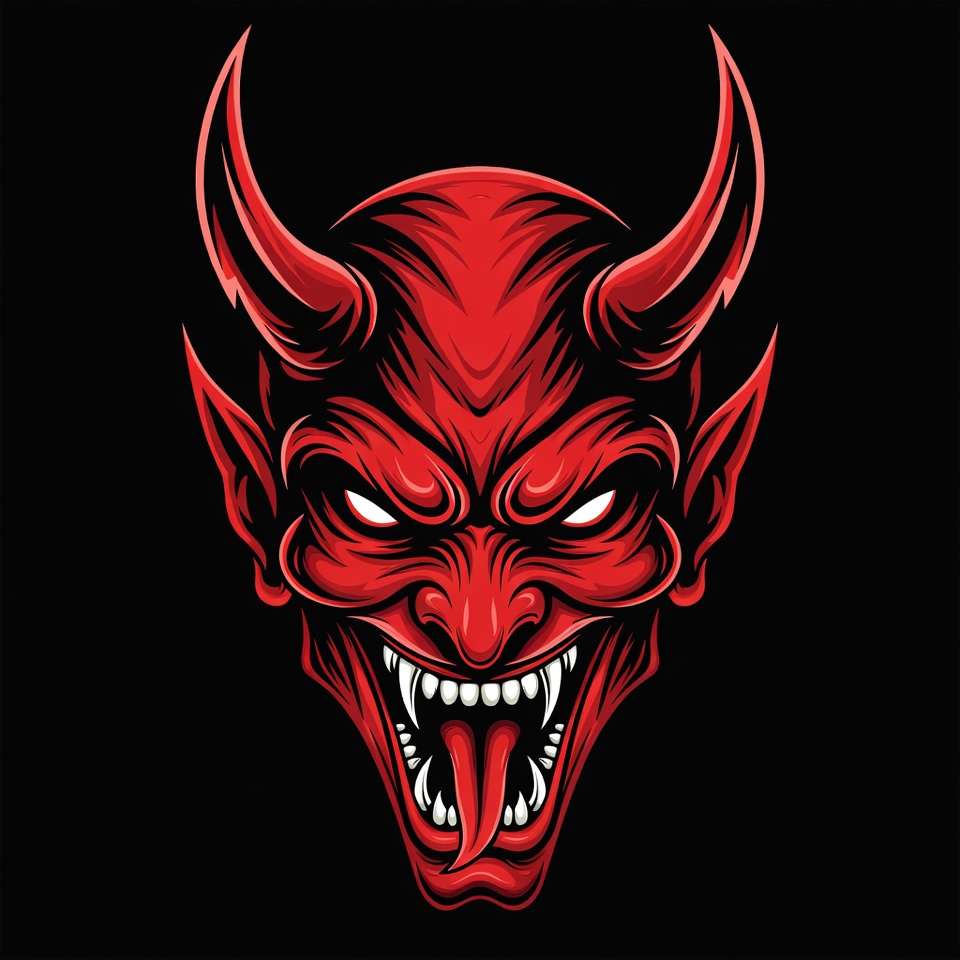 black background, demonic, devil, digital art, evil face, fangs, fantasy creature, fierce, glowing eyes, graphic design, hellish, horns, illustration, long tongue, monster head, red demon, roaring demon, scary demon, sharp teeth, vector art, demon