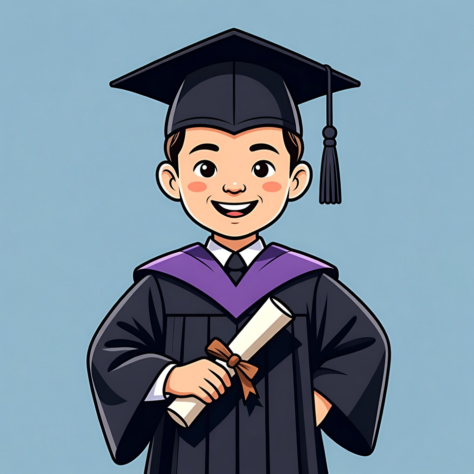 A cartoon boy with short black hair smiles happily while wearing a black graduation cap and gown with purple trim. He holds a rolled diploma tied with a ribbon in his right hand. The illustration features him on a plain light blue background.