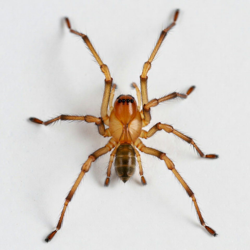 A small orange spider with long thin legs stands on a plain white surface. Its body features a reddish-orange cephalothorax and a darker banded abdomen. The spider faces forward with eight eyes visible on its head.