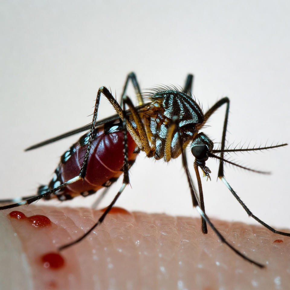 A detailed close-up of a mosquito with black, gold, and red body sucking blood from pale human skin. Blood droplets are visible around the bite site. The insect is positioned on a white background.