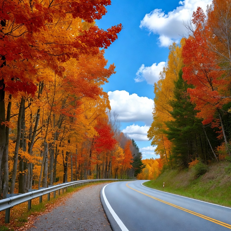 A winding paved road curves through a forest of maple trees with vibrant orange and red fall foliage. Fluffy white clouds dot the bright blue sky above the colorful canopy. Guardrails line the roadside amidst scattered fallen leaves.