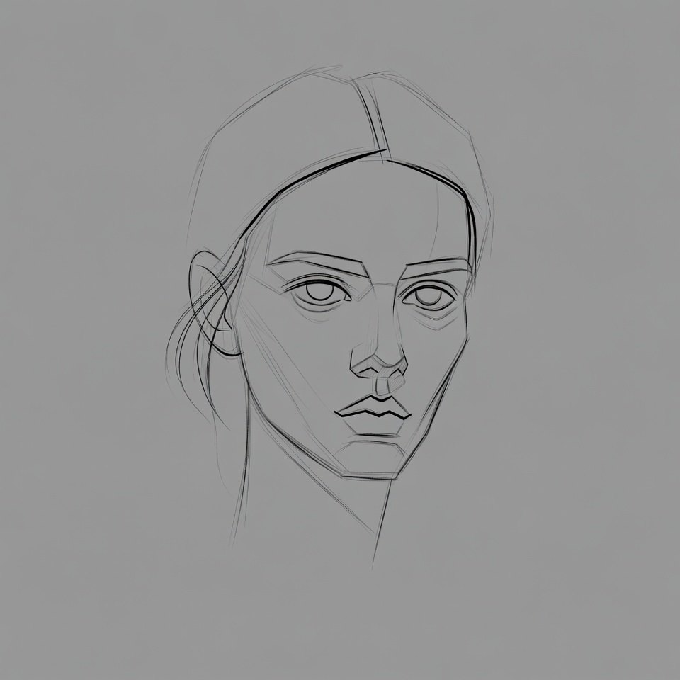 A detailed line drawing sketch depicts a young woman's face in profile view. She has long hair pulled back, prominent cheekbones, and expressive eyes. The artwork uses varying line weights on a plain gray background.