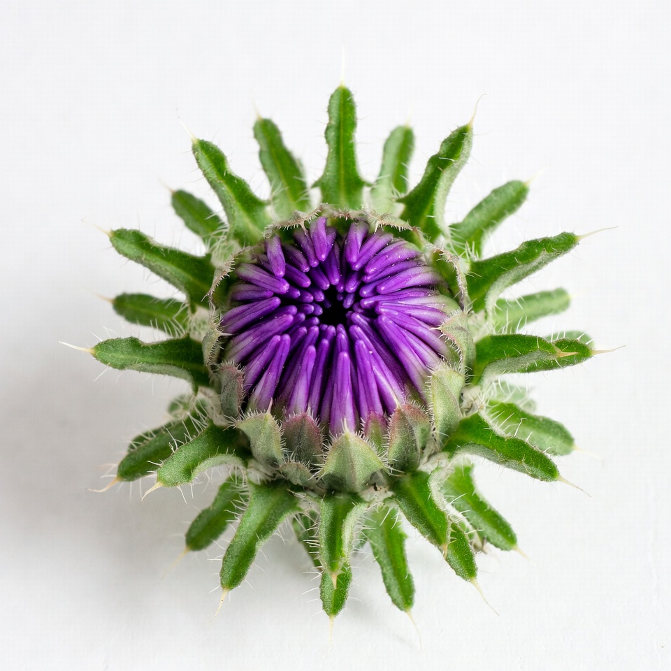 bloom, botany, flower, flower closeup, green, green bracts, isolated background, nature, purple, purple flower, spiky plant, thistle, white background, wildflower, thistle flower