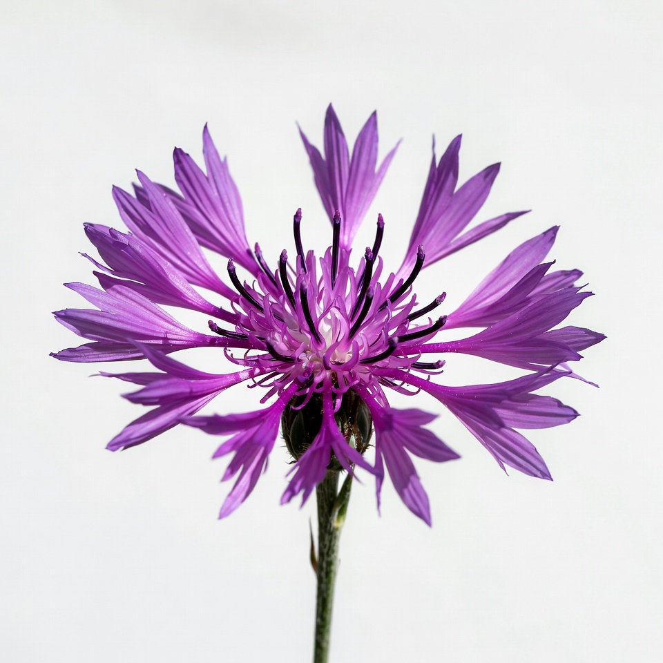 A vibrant purple cornflower blooms with numerous thin petals radiating from a dark central disk. The flower stands on a thin green stem against a plain white background. Fine details of the spiky purple petals and black stamens are sharply visible.