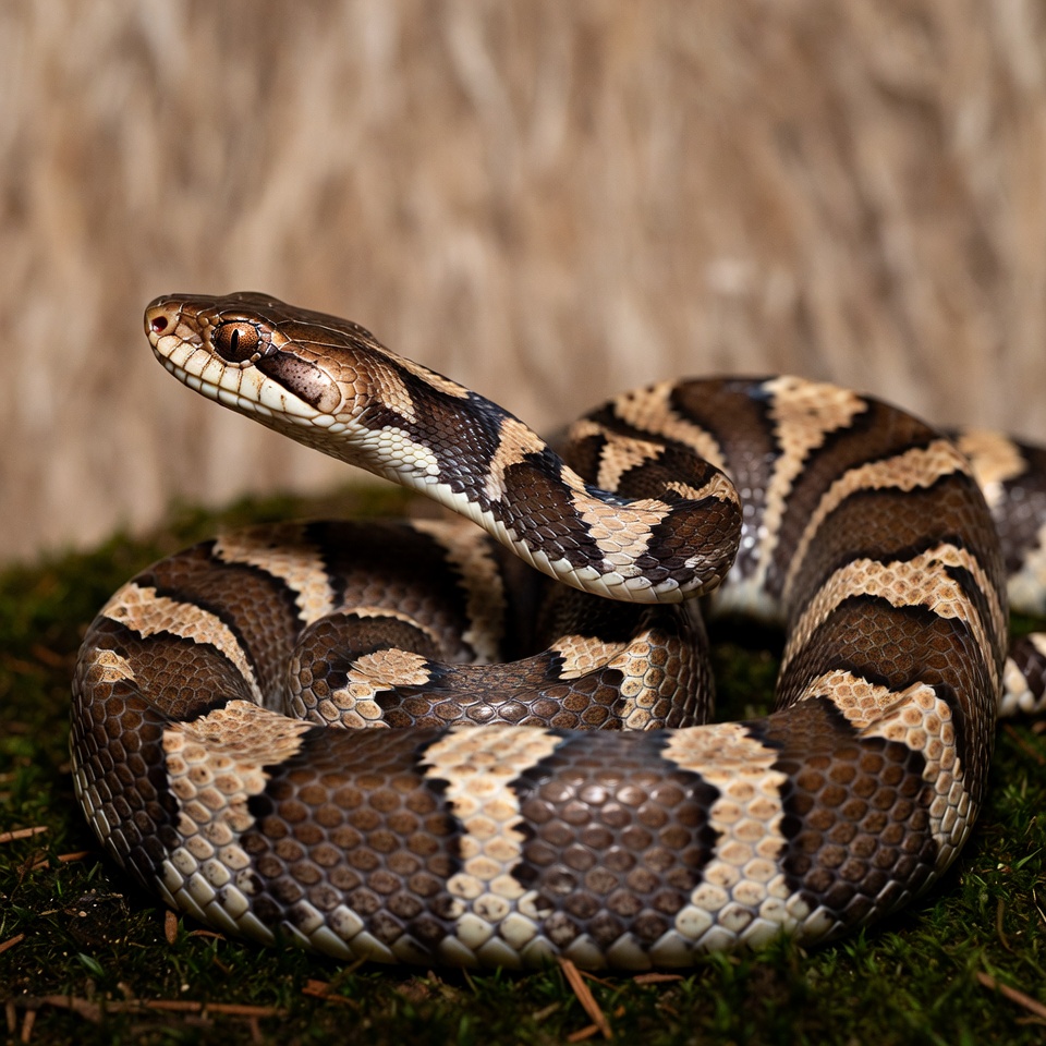 A keelback snake with brown and white striped patterns coils on green moss. Its head is raised with eyes focused forward and tongue slightly extended. The background features a textured thatched surface.