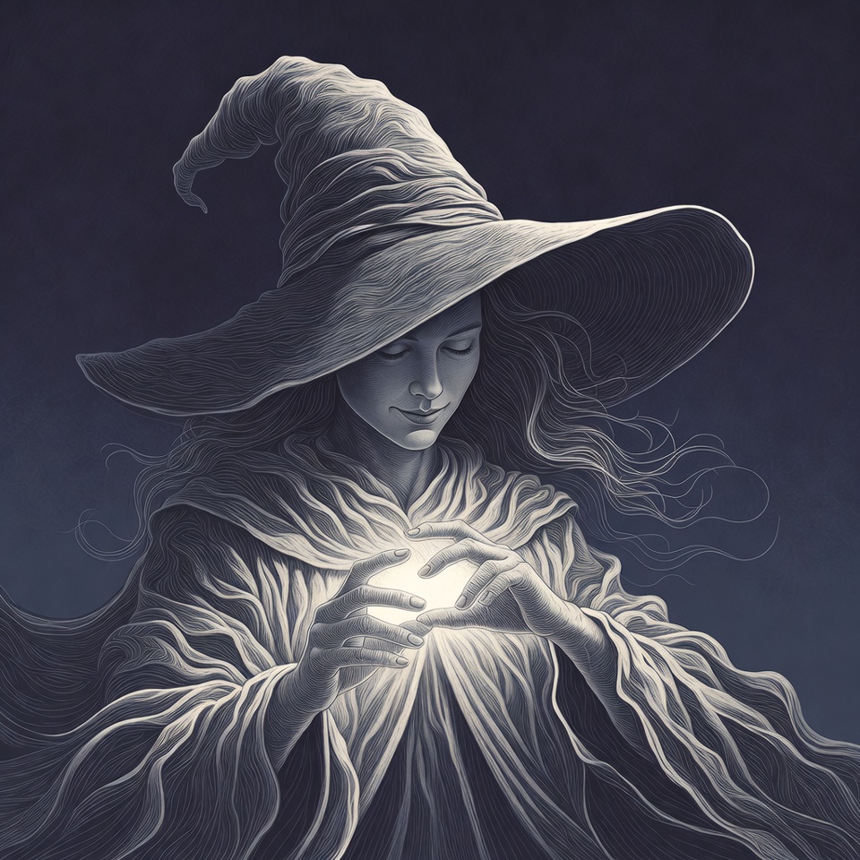 White, dark background, fantasy, female, flowing hair, glowing orb, illustration, magic, pointed hat, robe, witch hat, woman, young woman, witch