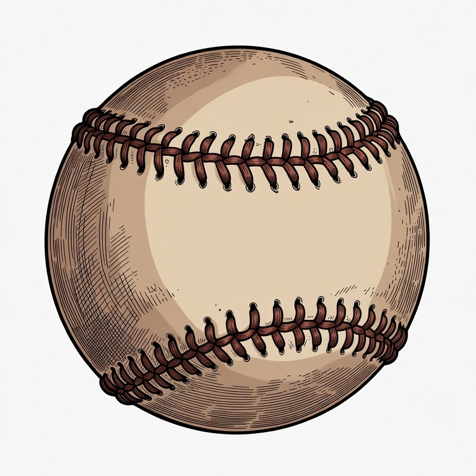 A detailed illustration of a classic baseball with red stitching on a white leather surface. The ball features curved seams forming the typical baseball pattern. It is depicted in a sketch style on an isolated white background.