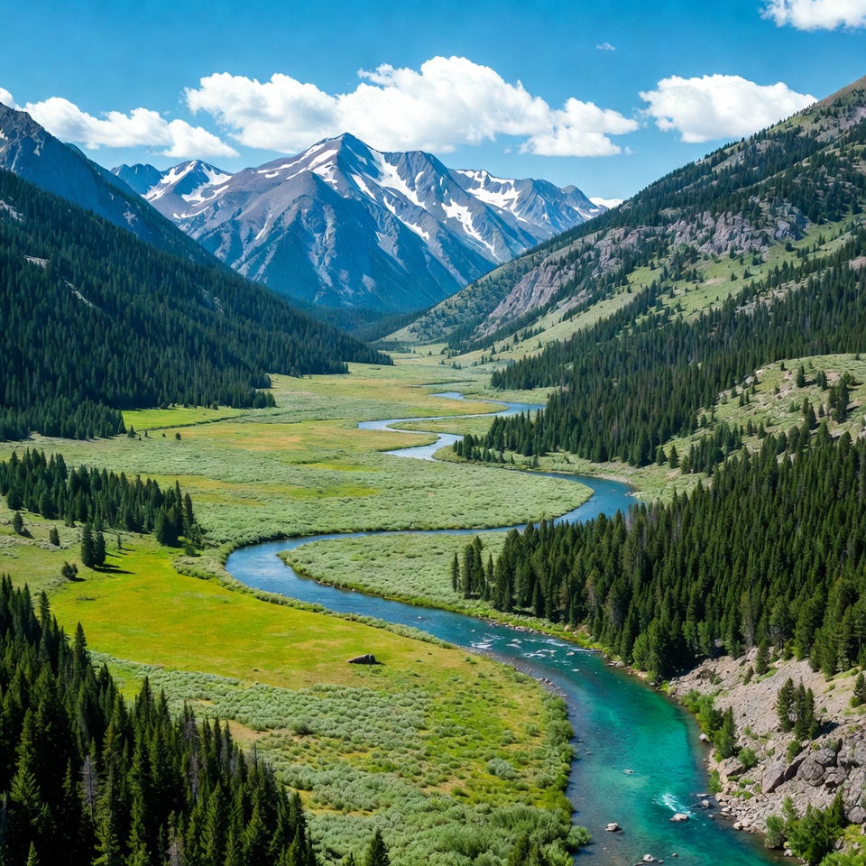 alpine scenery, blue sky, clear water, clouds, evergreen trees, forest mountains, green meadow, high peaks, landscape, lush grass, mountain valley, nature, pine forest, rocky banks, scenic view, snowy peaks, turquoise water, valley river, wilderness, river