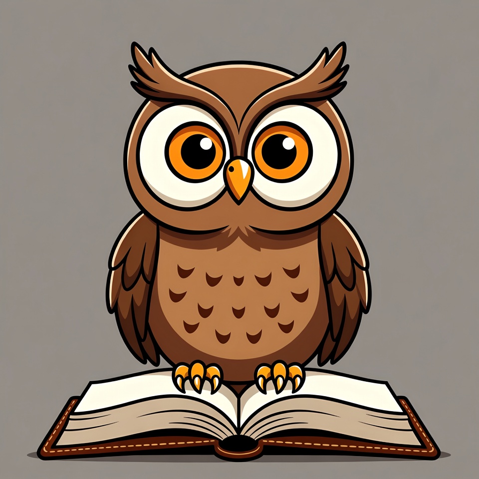 A cute cartoon owl with large orange eyes and brown feathers sits on an open book. Its wings are slightly spread, and orange talons grip the book's edges. The image features a simple gray background.