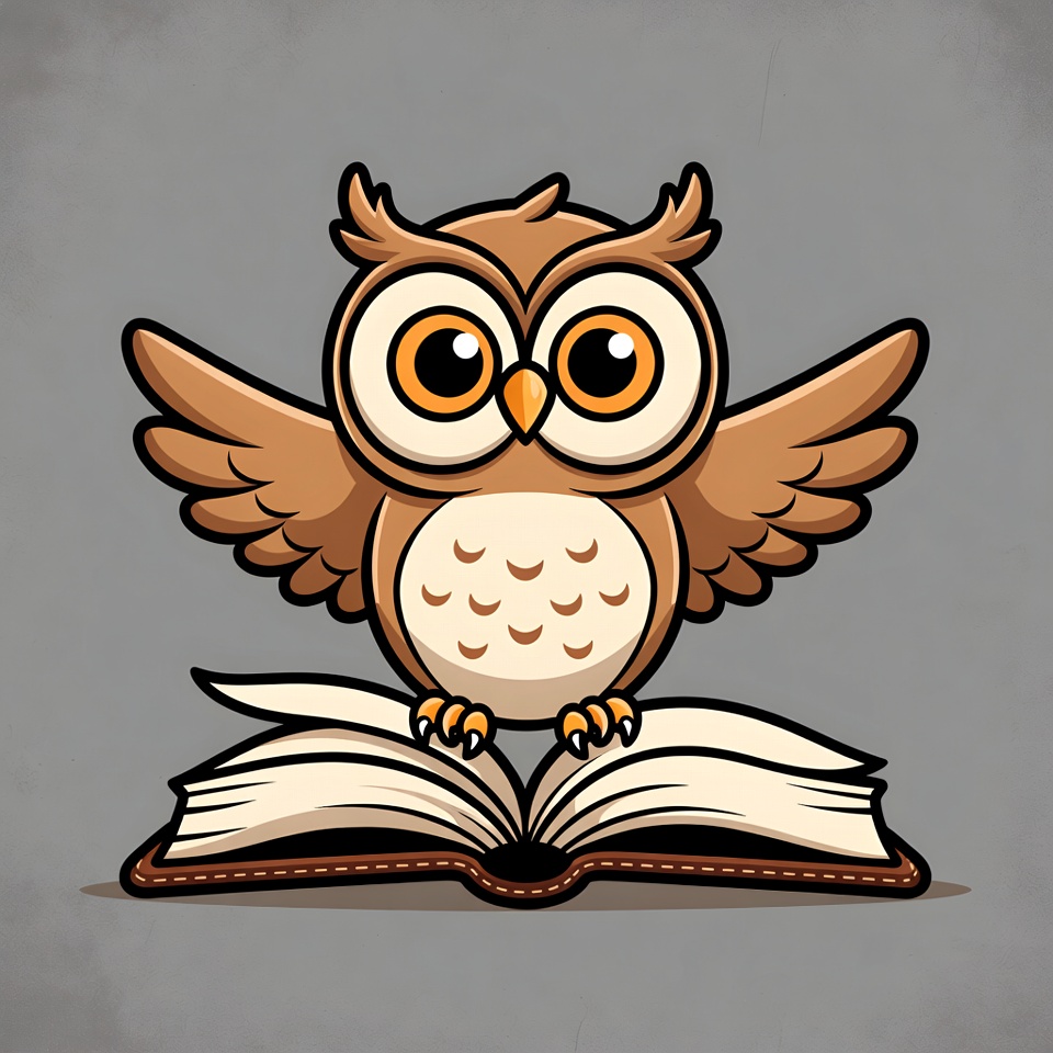 A cute cartoon owl with large orange eyes and brown feathers stands on an open book. Its wings are spread wide, and it grips the book's pages with orange talons. The illustration features a textured gray background.