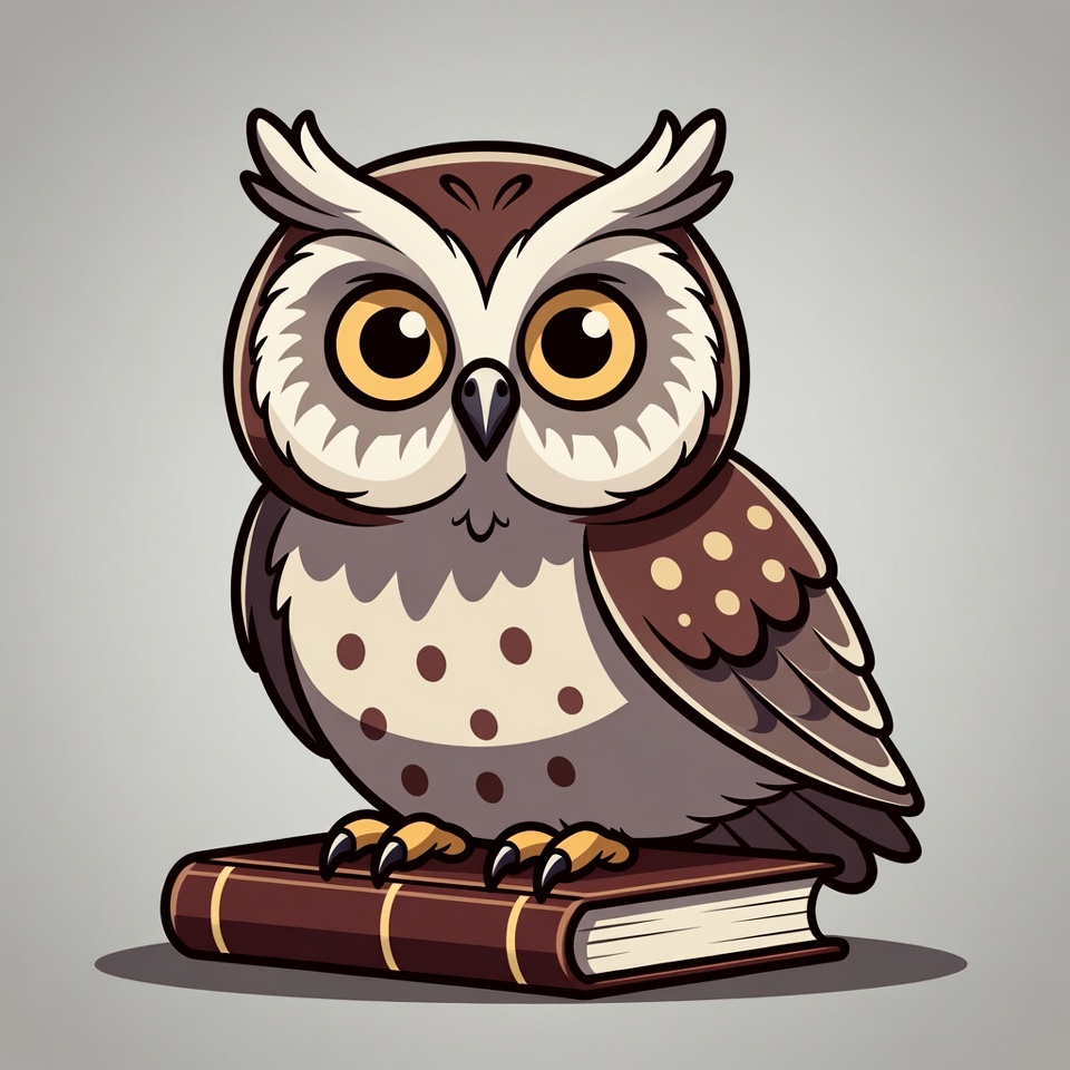 A cartoon owl with large yellow eyes and brown feathers sits perched on a thick brown book. The owl has white facial disc, spotted wings, and prominent ear tufts. It is illustrated in a kawaii style against a gray background.