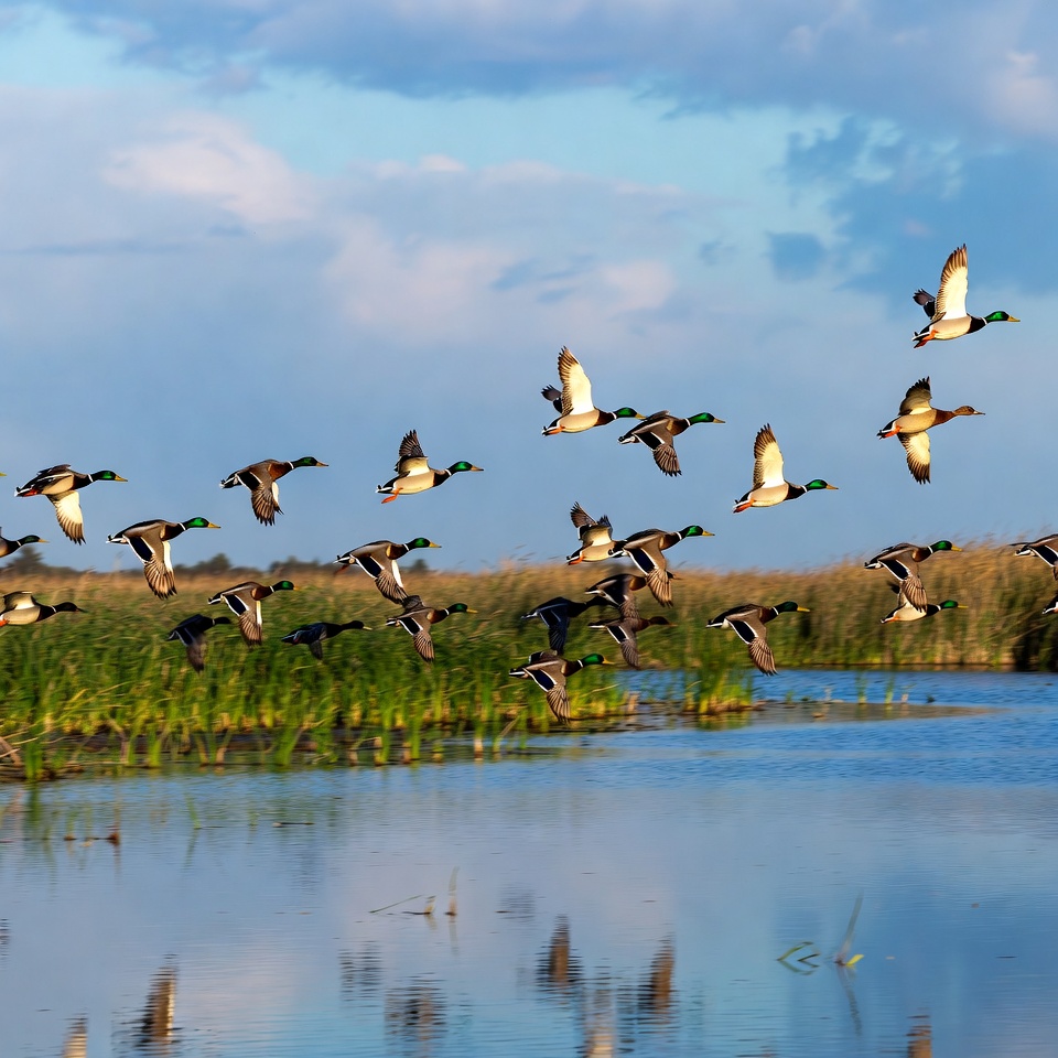 avian, bird migration, birds flying, blue sky, clouds, feathers, flight formation, flock, flying ducks, green reeds, lake, mallard ducks, marsh, nature, reeds, reflection, sunset light, water, waterfowl, wildlife, wings, ducks