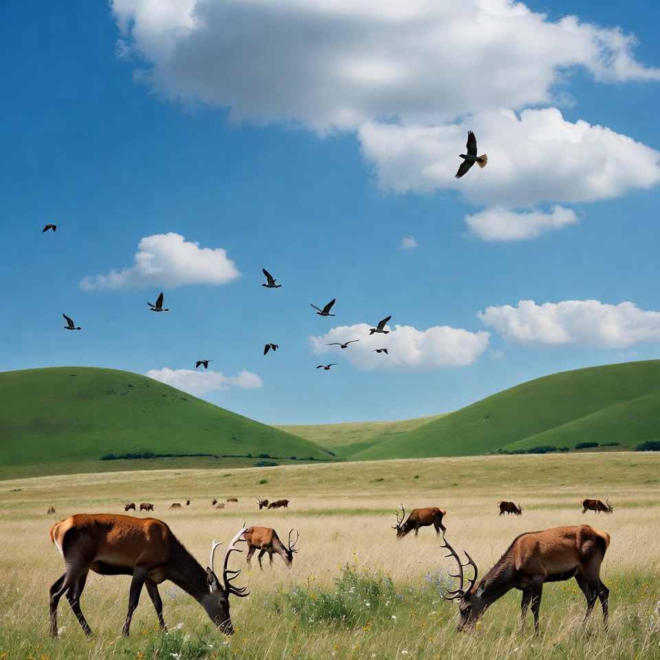 animals, antlers, blue sky, deer, field, flock birds, flying birds, grass, grazing, green hills, meadow, nature, outdoors, white clouds, wildlife, red deer