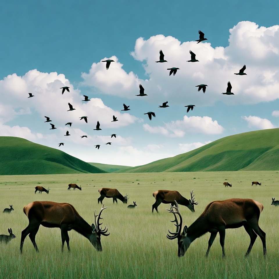 animals, antlers, birds flying, blue sky, deer herd, flock of birds, flying birds, grassy field, grazing deer, green hills, green landscape, illustration, meadow, mountains, nature, stag, valley, white clouds, wildlife, red deer