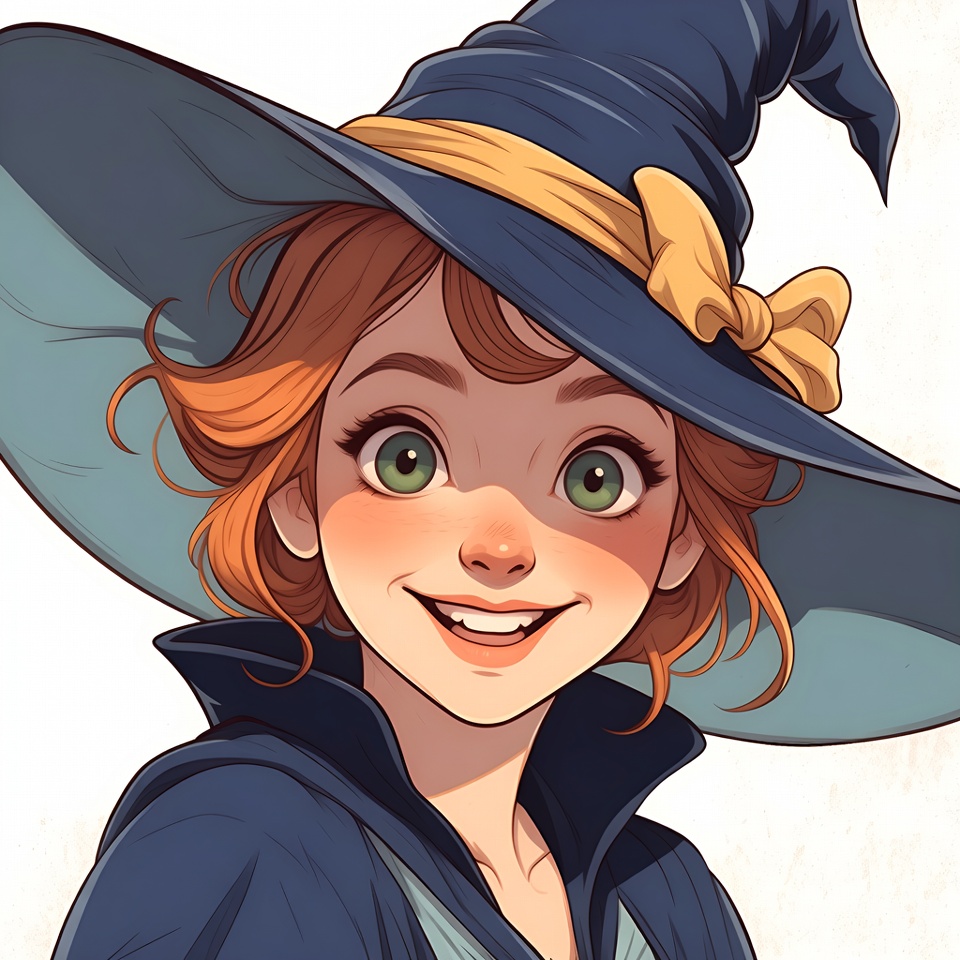 A young girl with curly orange hair and green eyes smiles happily while wearing a large blue witch hat with a yellow bow. She has a high collar on her dark robe and flushed cheeks. The illustration is on a white background.