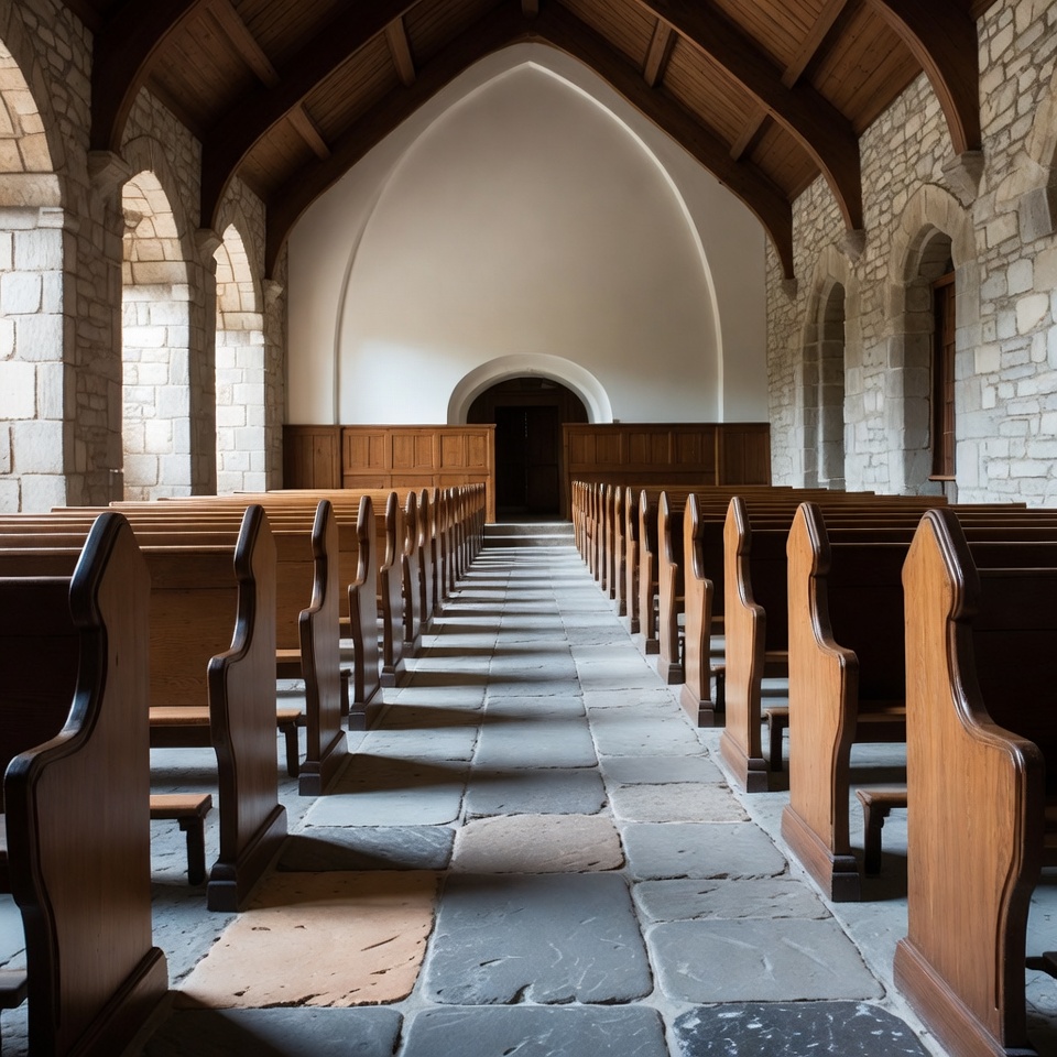 An empty chapel features rows of wooden pews lining a central stone-tiled aisle. Arched stone walls and a high wooden beamed ceiling frame the white apse at the far end. Sunlight streams through arched windows, casting shadows on the floor.