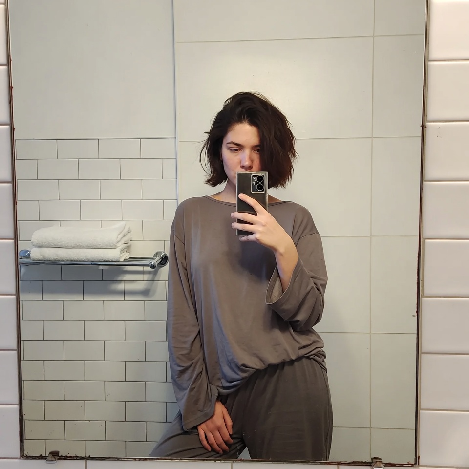 A young woman with shoulder-length dark hair takes a selfie in a white tiled bathroom mirror. She wears a loose-fitting gray long-sleeve top and matching pants, holding her phone up with one hand. White towels are folded on a shelf beside her.