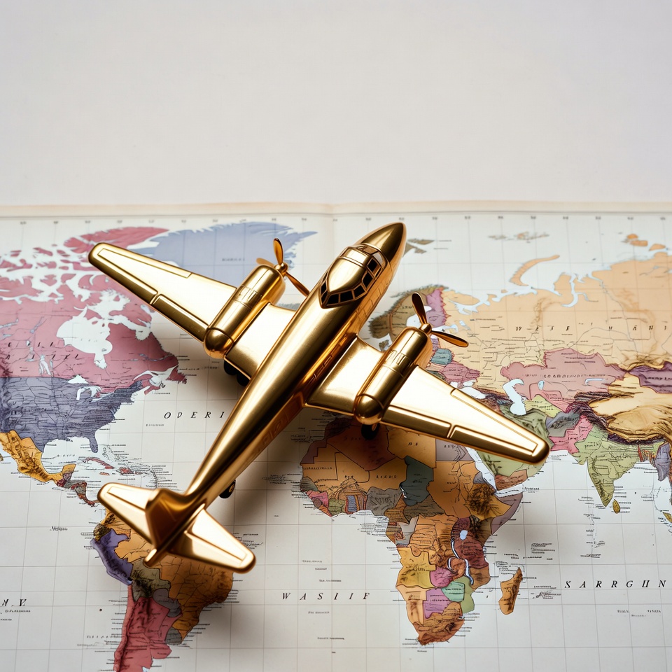 A small golden toy airplane with twin propellers sits atop an open world map. The map displays colorful continents including Africa, Europe, Asia, and the Americas. The airplane is positioned over Africa against a white background.