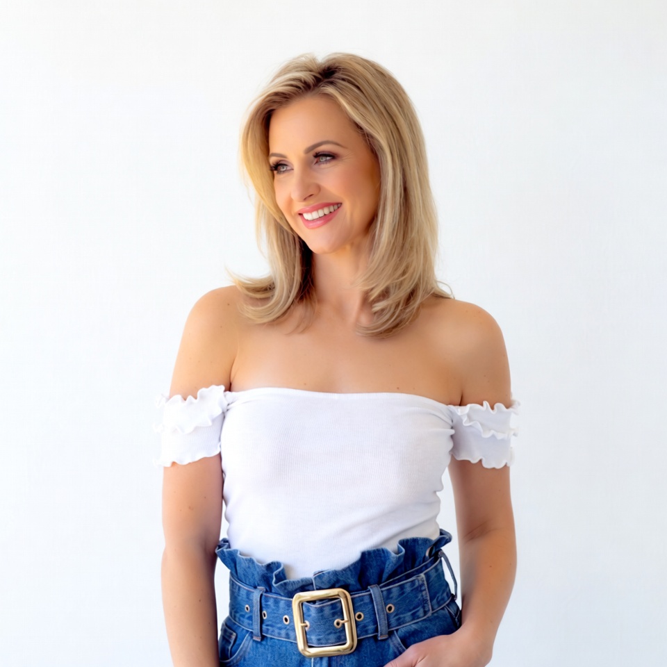 A blonde woman with shoulder-length hair smiles warmly while looking to the side against a plain white background. She wears a white off-shoulder top with ruffled sleeves and high-waisted blue denim skirt with a gold belt. Her pose is relaxed with hands near her hips.