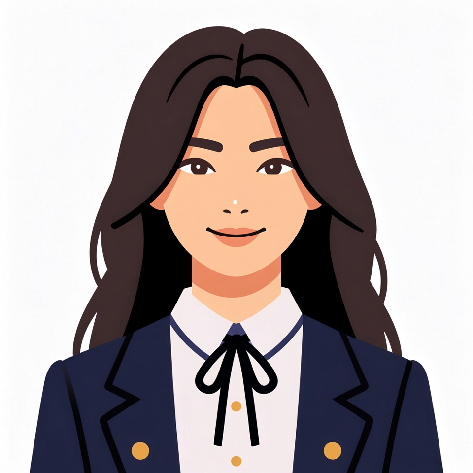A young Asian woman with long dark wavy hair smiles gently at the viewer. She wears a navy blue blazer with gold buttons, a white collared shirt, and a black bow tie. The illustration is on a plain white background.