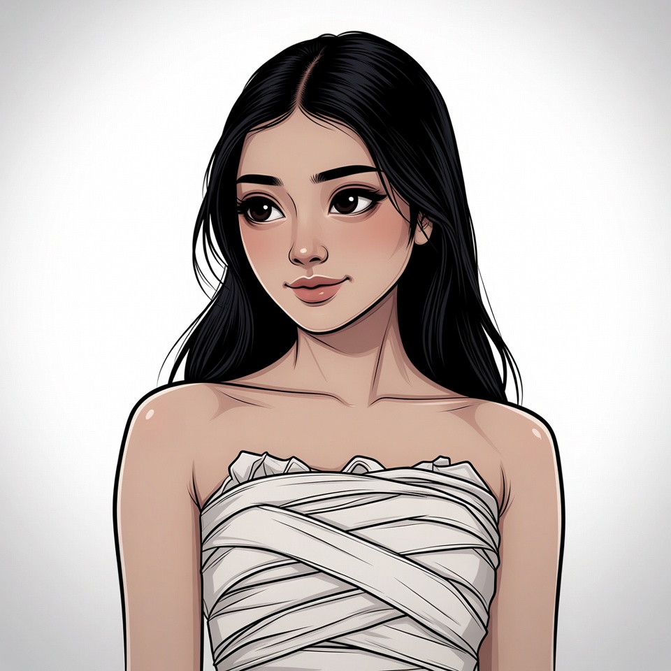 An illustration of a young Asian woman with long black hair and large expressive eyes gazes to the side. She wears a white bandage wrap styled as a strapless top covering her shoulders and chest. The artwork features a clean white isolated background.