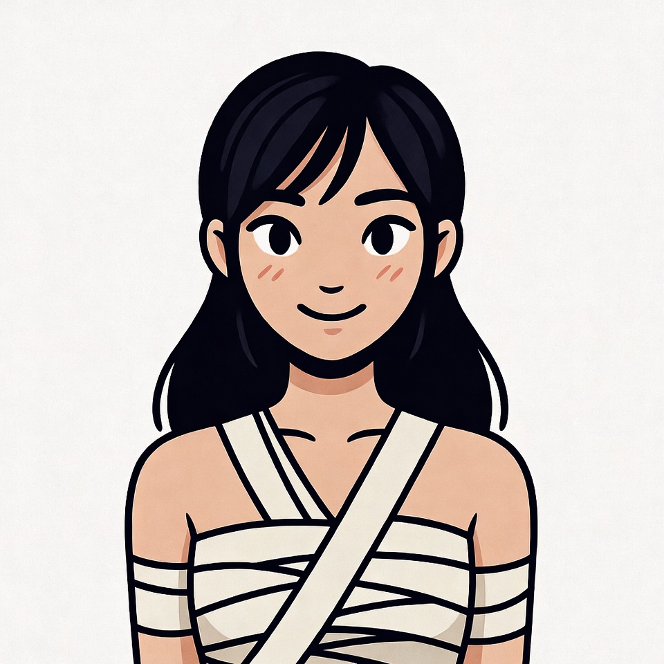 Asian, anime style, bandages, black hair, blush cheeks, cartoon, clipart, female, illustration, isolated background, large eyes, long hair, smiling, white bandages, wrapped torso, young woman, woman