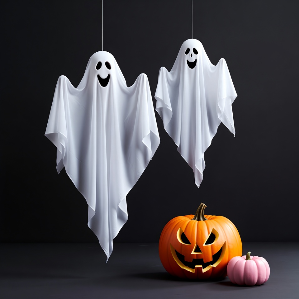 Two white fabric ghosts with smiling black faces hang from strings against a dark background. Below them sits a carved orange jack-o-lantern pumpkin with a spooky face, accompanied by a small pink pumpkin. The Halloween decorations are isolated on a black backdrop.