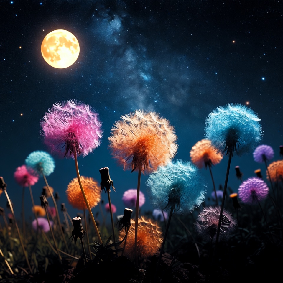 Vibrant colorful dandelions in pink, orange, blue, and purple hues stand in a grassy field under a glowing full moon. The Milky Way galaxy and twinkling stars illuminate the night sky above the fluffy seed heads. The scene features a dreamy cosmic background with scattered stars.