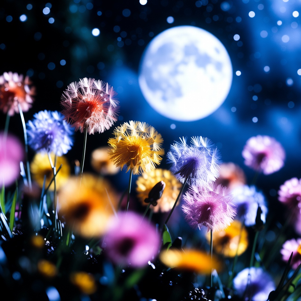 Colorful Dandelions Under Full Moon