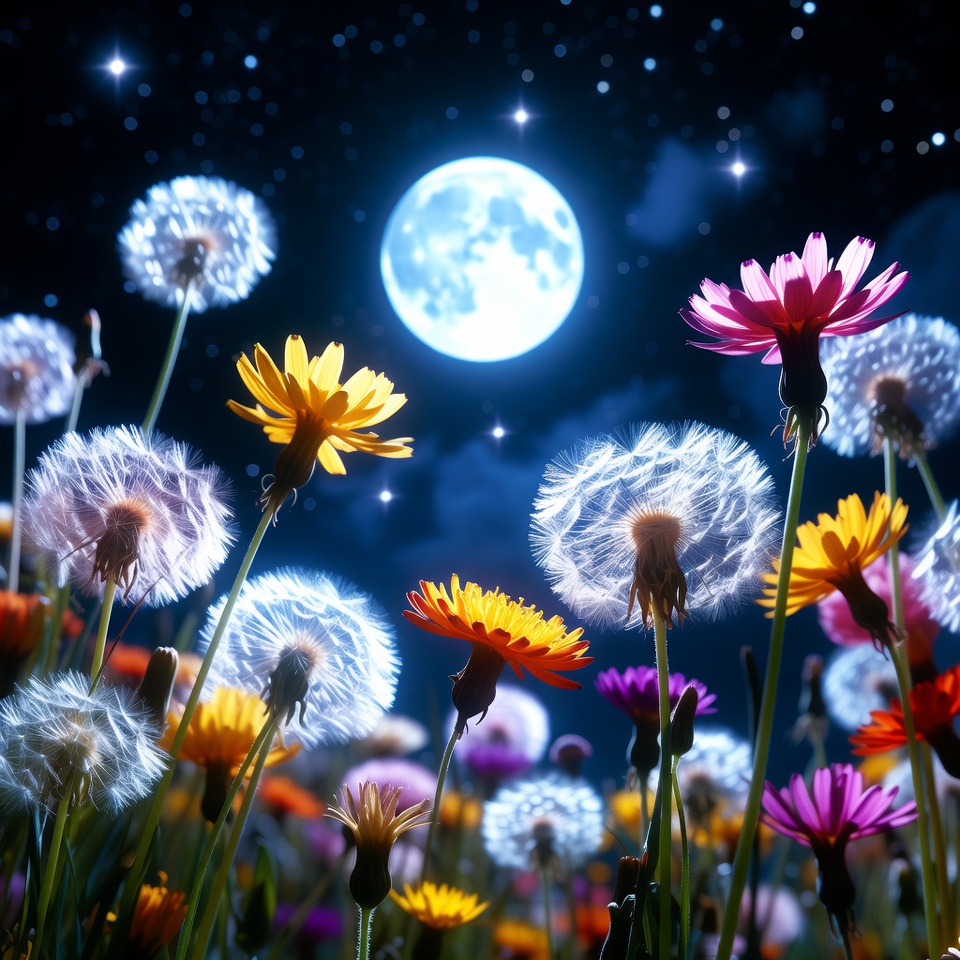 A vibrant field of dandelions and colorful flowers glows under a large full moon at night. White dandelion puffs and blooms in pink, yellow, purple, and orange rise towards the starry sky. The scene features a bright blue moon surrounded by twinkling stars on a dark background.