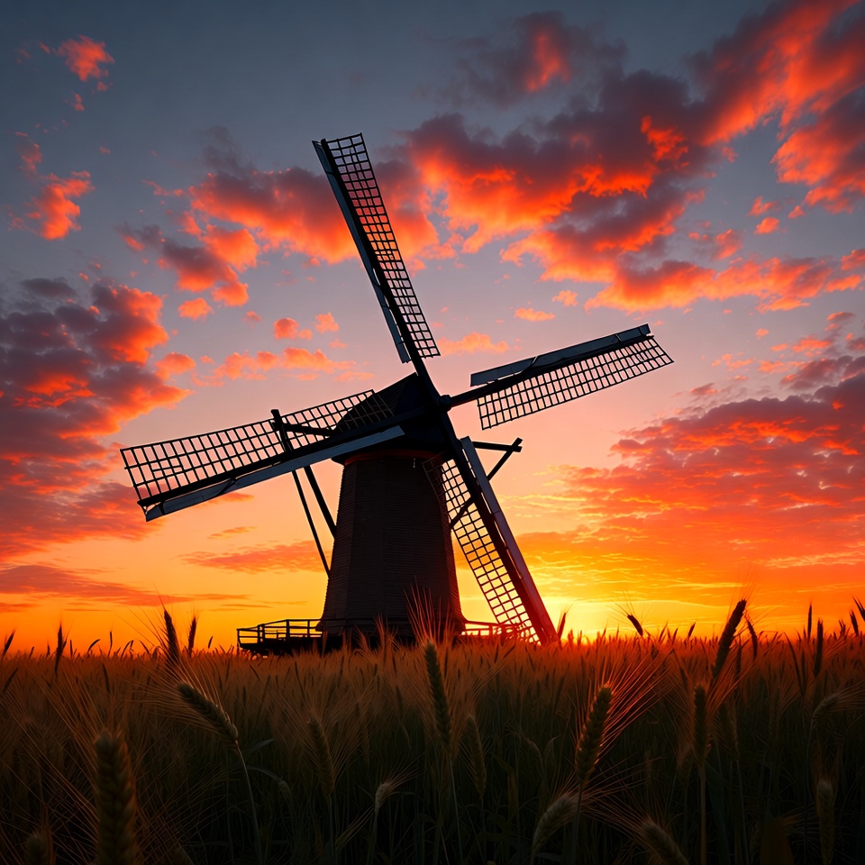 A traditional windmill stands silhouetted against a vibrant orange and red sunset sky with scattered clouds. Golden wheat fields surround the base of the windmill, swaying gently. The scene captures the windmill's wooden blades and structure in dark outline.