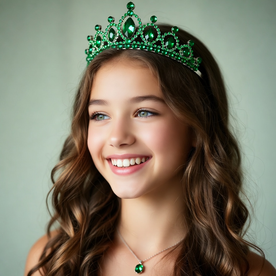 A young girl with long wavy brown hair smiles while wearing a sparkling green rhinestone crown. She has green eyes and a subtle necklace with a green pendant. The image is set against a plain light background.