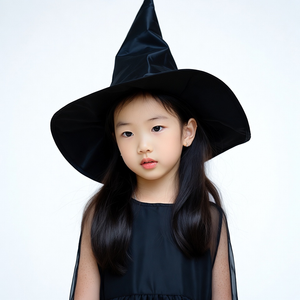 A young Asian girl with long black hair wears a tall black pointed witch hat. She has sheer black sleeves and stands against a white background. Her expression is neutral with slightly pursed lips.