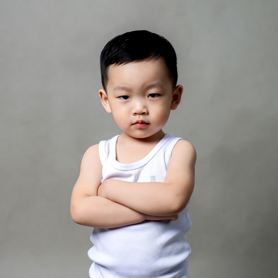 A young Asian boy with short black hair stands with arms crossed against his chest. He wears a plain white tank top and has a serious expression on his face. The background is a solid gray.