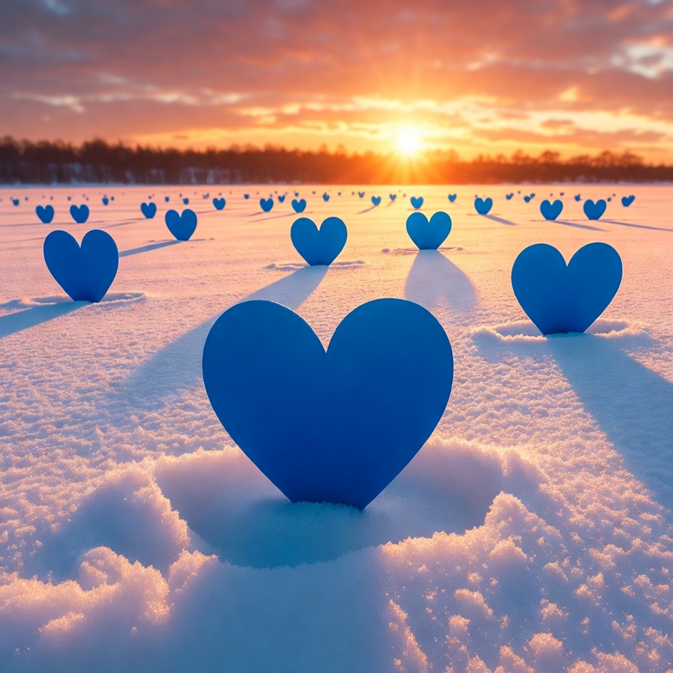 Numerous blue heart-shaped objects stand on a vast snowy field under a vibrant sunset sky with orange and purple hues. The sun is low on the horizon, casting long shadows from the hearts onto the snow. A dense forest lines the background.