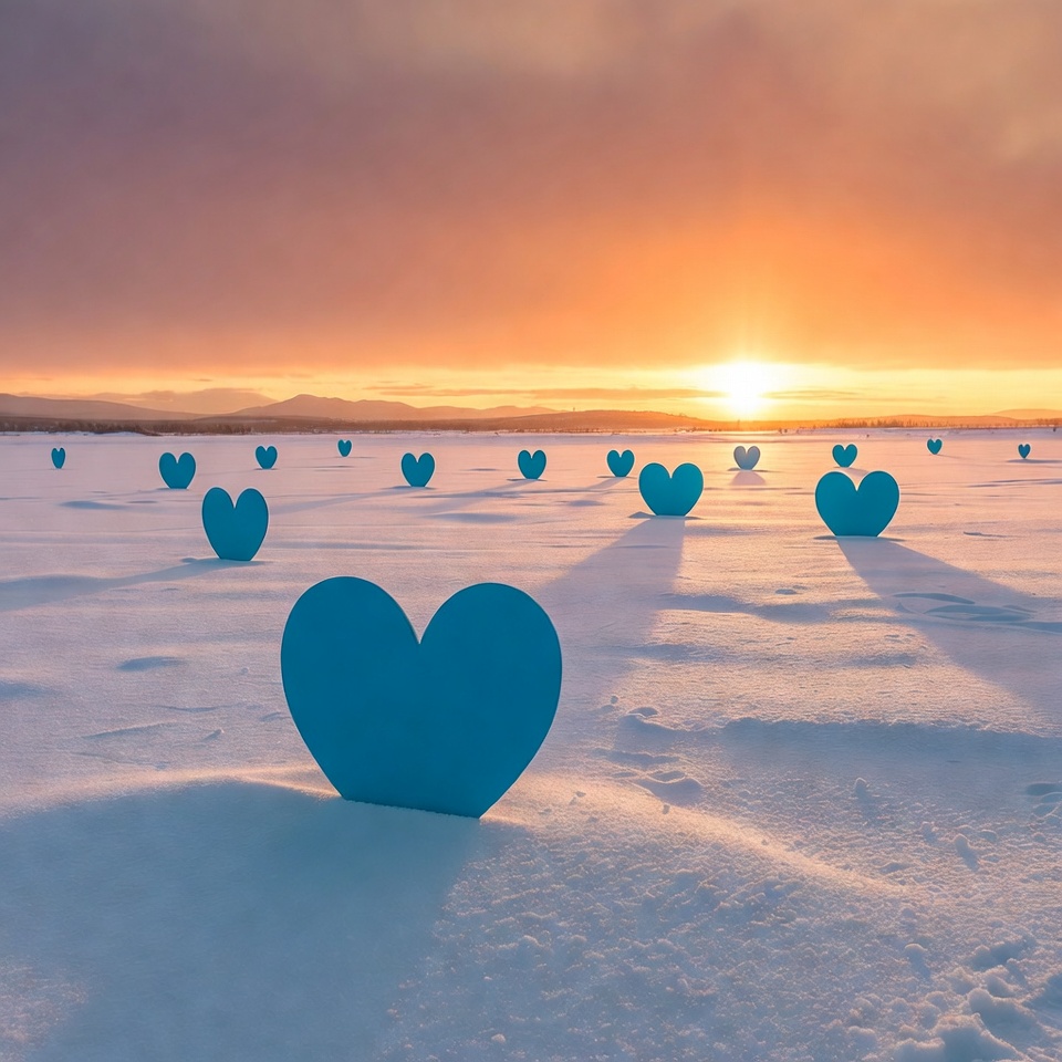 Numerous blue heart sculptures stand scattered across a vast frozen lake covered in snow. A vibrant sunset with orange and pink hues illuminates the sky, casting long shadows from the hearts. Distant mountains frame the serene winter scene.