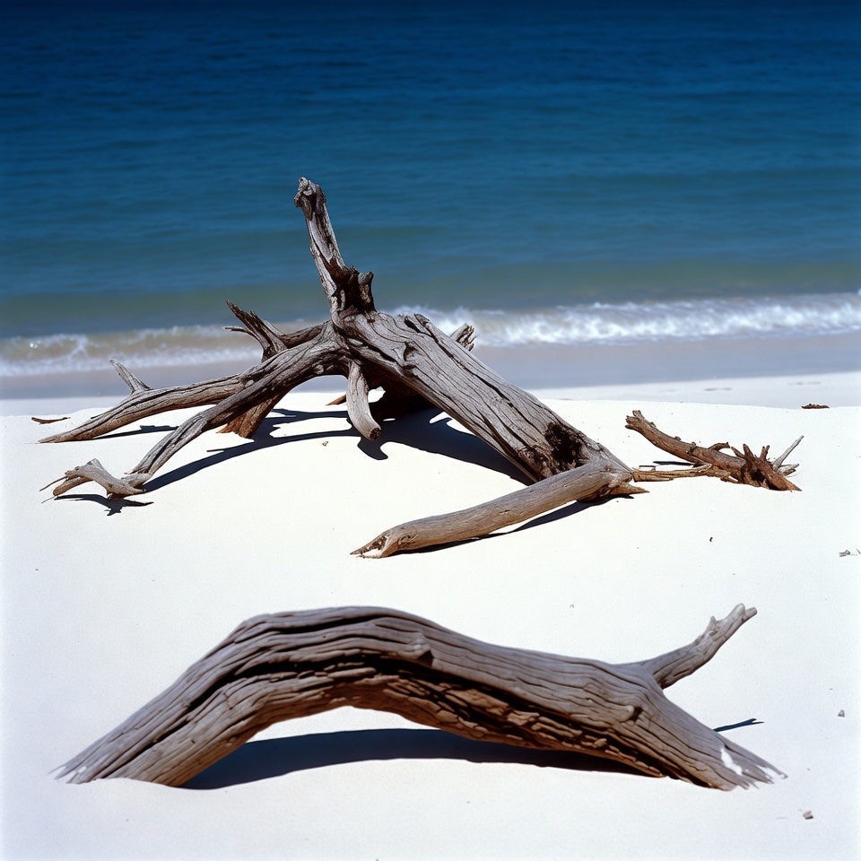 Twisted pieces of driftwood lie on a white sandy beach near the turquoise ocean waves. The wood shows weathered branches and curves against the bright shoreline. Clear blue water and gentle surf are visible in the background.